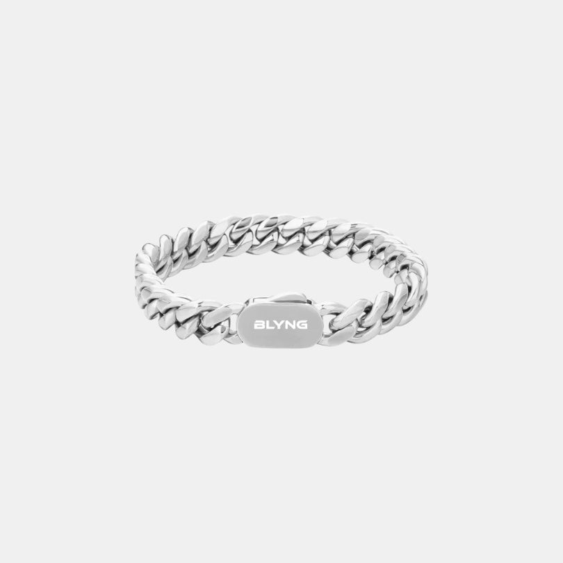 Bold feel. Clean finish. The BLYNG 8MM Cuban Bracelet in silver delivers strong presence with polished links — made to flex every day.