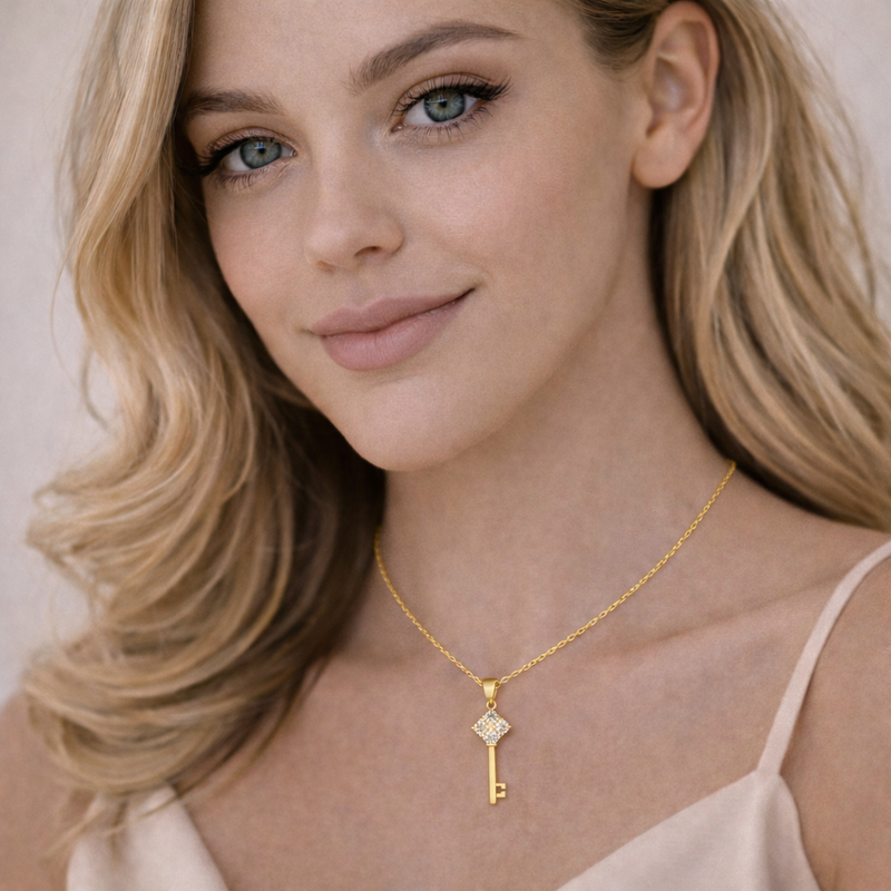 Delicate and symbolic, the Celeste Key Necklace is designed to add a refined touch to any outfit. Featuring a key-shaped pendant adorned with sparkling cubic zirconia on a slim gold-plated stainless steel chain, this piece is perfect for layering or wearing alone for everyday elegance or special occasions.