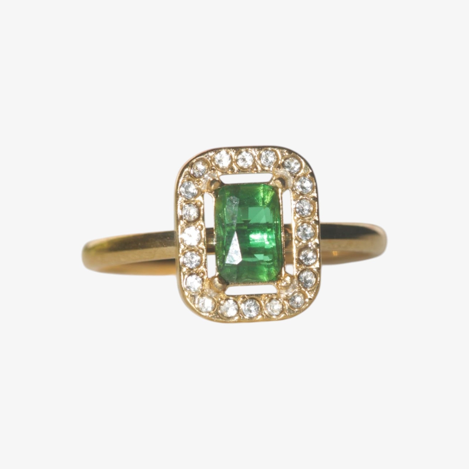 A vivid green stone framed by gentle sparkle—elegant, calm, and quietly radiant.