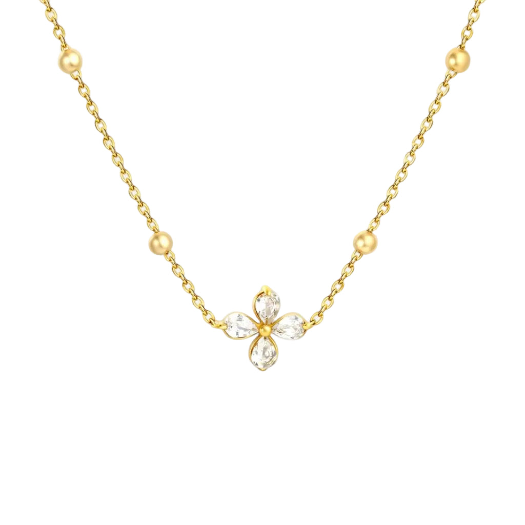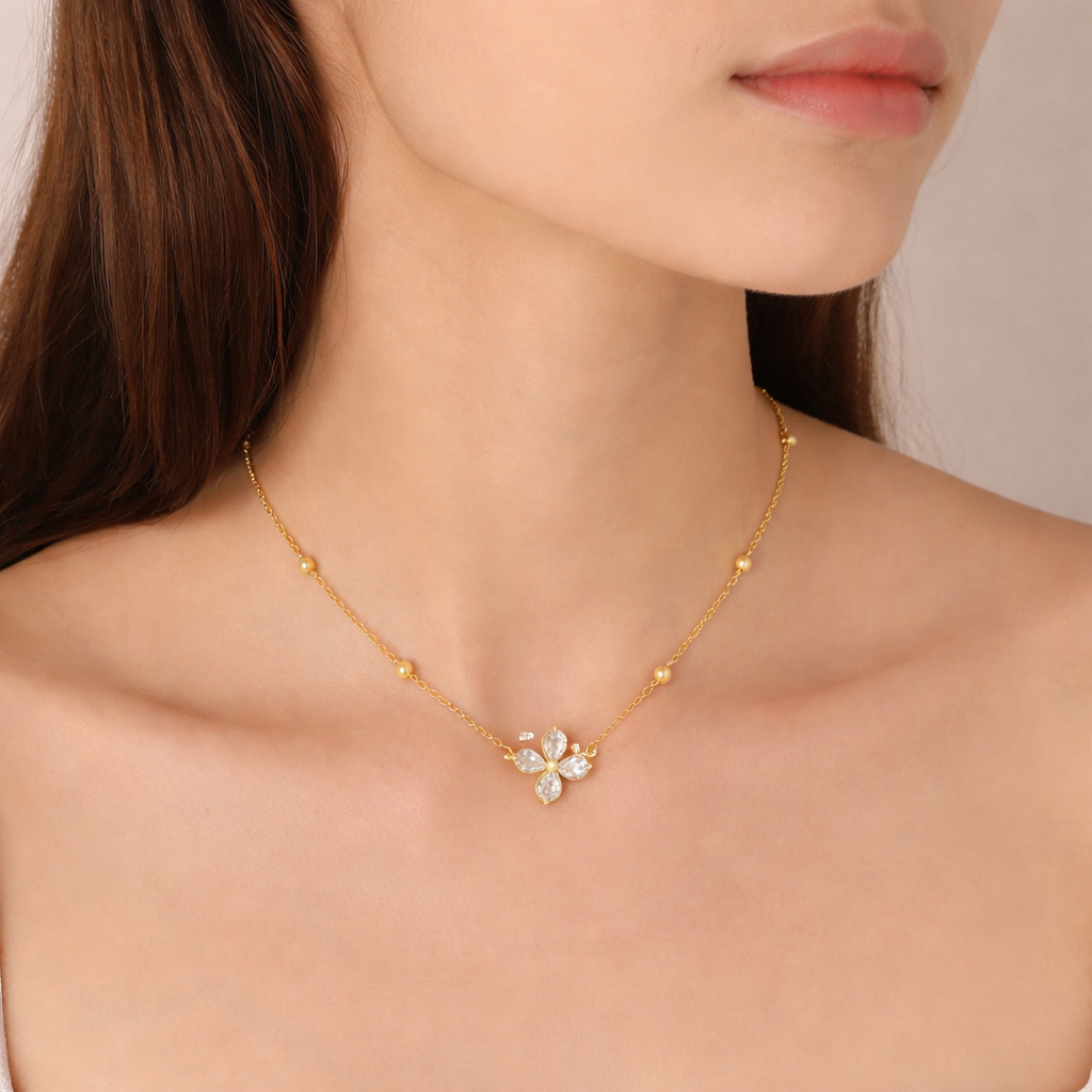 A crystal-set flower rests on a delicate gold chain with subtle bead accents, creating a look that feels radiant, feminine, and effortlessly refined.